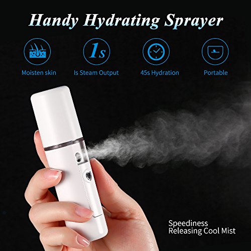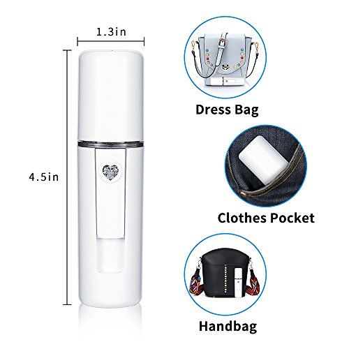 -. Feature : [Nano Technology Deep Hydrating ]: Ultra high speed vibrating technology, split water into tiny nanometer particles to make the effective components penetrate into skin and deep hydrating without ruining makeup / [Spray Distance &Time]: Just slip down the switch; 5CM apart between your face and face steamer if without makeup while 12-15CM if you make up; Automatically shut off per 60 seconds / [USB Recharge]: Connected with mobile power bank, Computer, vehicle for charge, and 2hours for full charge, Built-in 550mah rechargeable battery / [Water Replenishment ]:20ML water tank, Continues use last 10 times; Better use Mineral water and do no fill with Distilled water ,running water or high concentration essence astringent / [Ideal Gift]:Perfect gift for your family and friend on Christmas Day ,Thanksgiving Day, Valentine's Day ;Mini design that can be put in bag or pocket