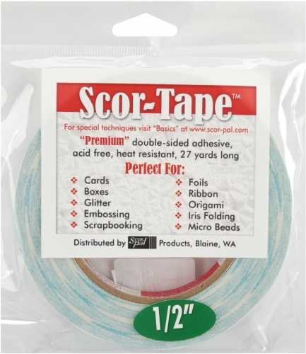 SCOR-PAL-Scor-Tape. Premium double-sided adhesive that is perfect for cards; boxes; glitter; embossing; scrapbooking; foils; ribbon; origami; iris folding; micro beads; and much more! This tape is acid free and heat resistant. Measurements: 1/2in. x 27 yards. Imported.Feature