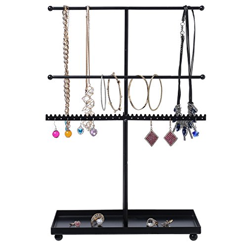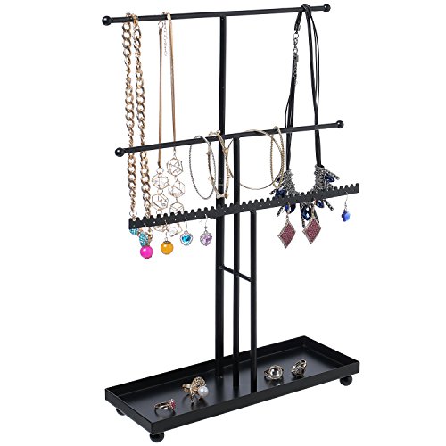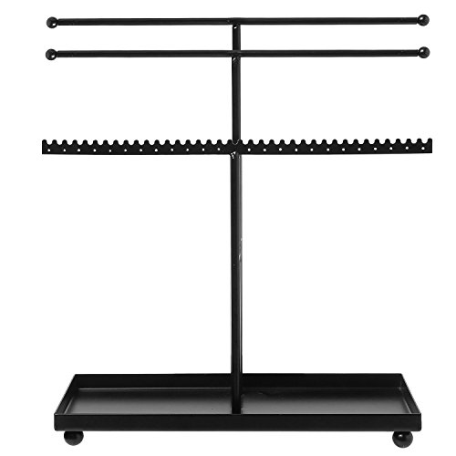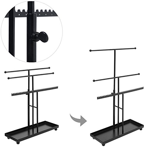 3 Tier Black Metal T-Bar Jewelry Display Stand Organizer with Ring Tray & Adjustable Top Bar