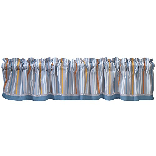 - A colorful striped window valance with a pretty blue border coordinates perfectly with the charming collection