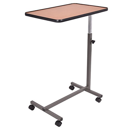 Description This over bed table is ideal for eating, reading, writing, playing games, or using your laptop while you're in bed. Thanks to the height adjustability, the table fits over any bed for your comfort. Equipped with 4 swivel casters, the table is easy to move around. In addition, the tabletop can be tilted to various angles to meet your demands. Made of solid steel and MDF, the table is strong and durable for years of use. The table top is smooth and easy to clean with a damp cloth. With this bedside table, you can relax on your bed or lounge on your sofa and still get your work done. Specifications Color: Beige table top Overall size: 26.3' x 16.3' x (28.3" - 43.3") Tabletop size: 16' x 24' Tabletop adjustment height: 28.3" - 43.3" Material of tabletop: PVC, MDF Material of base: Steel Shipping Details Standard Shipping: Our warehouse is in America,you will get the lovely item in 5-10 Business days via UPS or USPS. 0