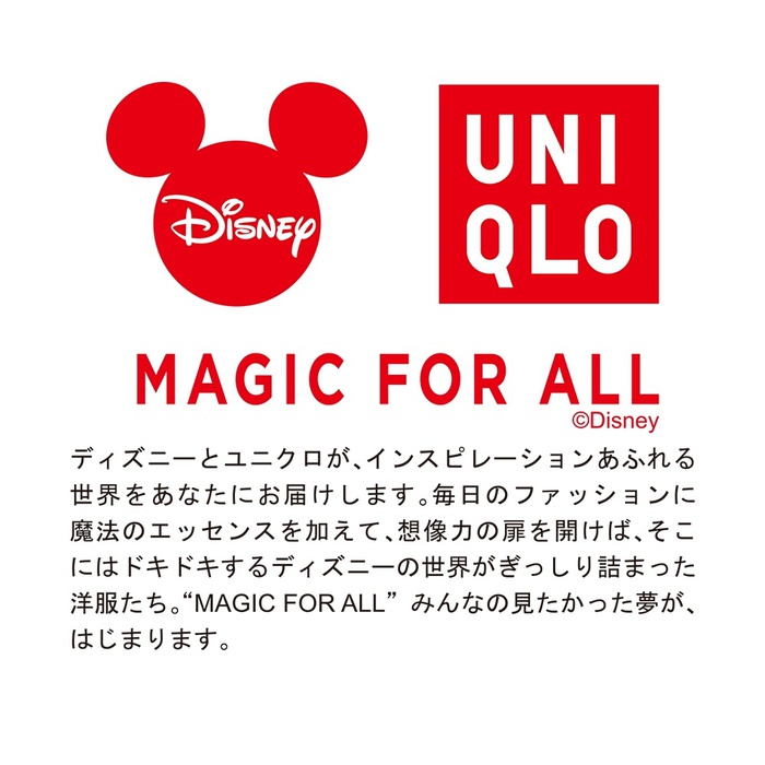 디즈니와 유니크로가,인스피레이션(영감) 넘치는 세계를 당신에게 전달합니다.매일의 패션에 마법의 에센스를 또한,상상력의 문을 열면,거기에는 두근두근 하는 디즈니의 세계가 가득 가득찬 양복 들.“MAGIC FOR ALL” 모두가 보고 싶었던 꿈이,시작됩니다.