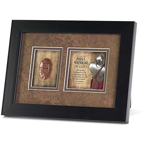 This is a framed matte art and token featuring the Ephesians 6 Full Armor of God scripture. The frame is matte black and comes with an easel back and sawtooth wall hanger.