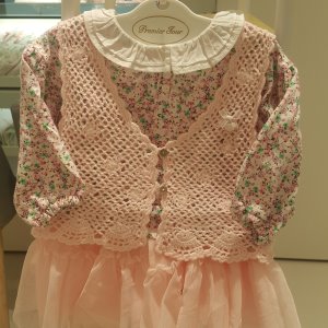 분홍 노랑 꽃무늬 티셔츠 털실로 직접 짠듯한 조끼와사랑스런 캉캉 치마가