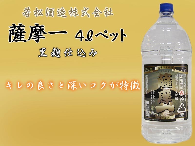 若松酒造株式会社  薩摩一 25度 ペット 4000ml厳選された鹿児島県産「黄金千貫」を黒麹で丹念に仕込んだ味わいは、深いコクを持ちながら、キレのある飲み口を実現しています。また甘美で華やかな香りからは、薩摩の大地の恵みを感じます。酒類:芋焼酎メーカー : 若松酒造株式会社原材料:さつまいも・米麹麹:黒麹蒸留:常圧容量:4000mlアルコール分:25%