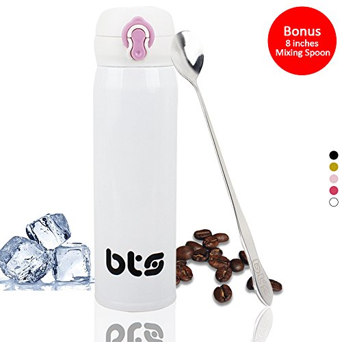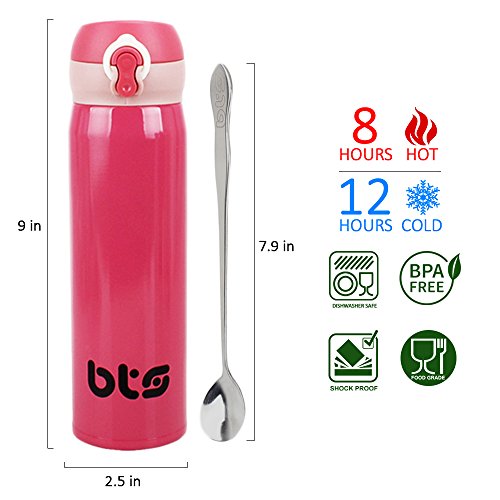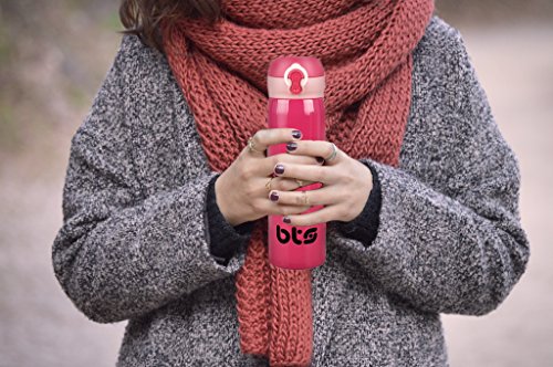 ERGONOMIC DESIGN AND SEAL LID: Bts travel mug provides easy to use in daily activities. You can open with one hand by pressing button and sup. Definitely it can't leak out through lock system and you don't encounter a bad surprise.