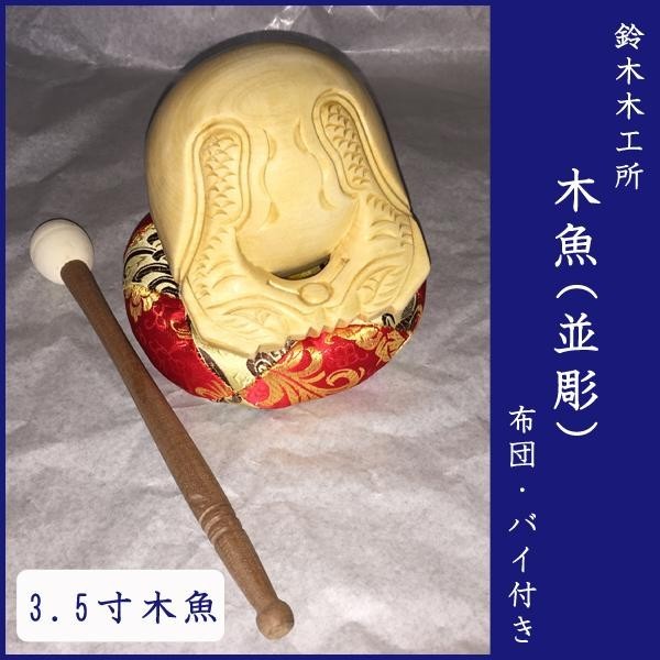 一般的な木魚と布団、バイのセットです。 製造国:日本 素材・材質:木魚:楠バイ:樫 商品サイズ:木魚:直径10.5cm、布団:直径15×厚さ4cm、バイ:長さ24cm 重量:総重量:700g セット内容:木魚、布団、バイ ※サプライヤー直送品 ご注文後3~4営業日後の出荷となります【商品名】鈴木木工所 3.5寸木魚(並彫) 布団・バイ付き