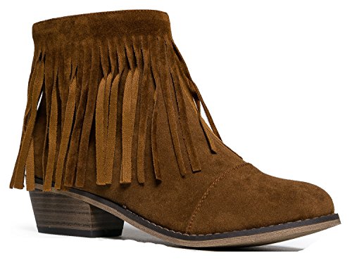 Product Description Get more out of your wardrobe with brown, fringe booties! Western ankle boots are versatile with it's vegan suede upper and low, wooden, block heel. Inside zipper closure for the girl on-the-go. 0