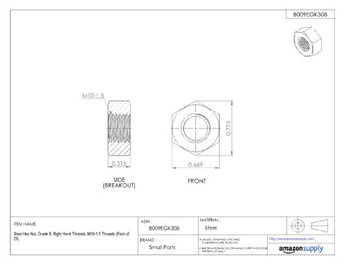 Steel Hex Nut, Zinc Plated Finish, Class 8, JIS B1181, M10-1.25 Thread Size, 14 mm Width Across Flats, 8 mm Thick (Pack of 25)