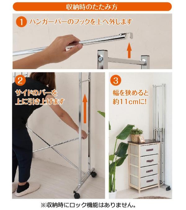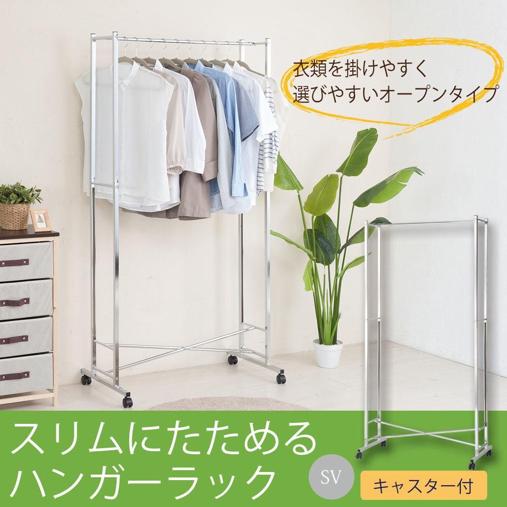シルバーの輝きが美しく清潔感があり、装飾のないシンプルデザインのハンガーラックです。使わない時はスリムに折りたたんですき間に収納可能♪普段使いのハンガーラックとしてはもちろん、洗濯物の一時的な置き場所や部屋干しのランドリーラックとしてもお使いいただけます。衣類をかけたままでの移動もスムーズなキャスター付。 |