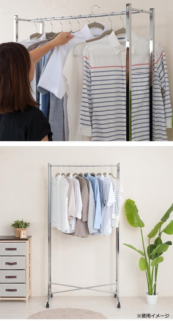 | シルバーの輝きが美しく清潔感があり、装飾のないシンプルデザインのハンガーラックです。使わない時はスリムに折りたたんですき間に収納可能♪普段使いのハンガーラックとしてはもちろん、洗濯物の一時的な置き場所や部屋干しのランドリーラックとしてもお使いいただけます。衣類をかけたままでの移動もスムーズなキャスター付。 |
