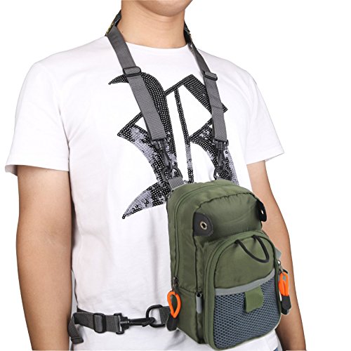 -. Binding : Misc. -. Brand : SHANGYAO -. Color : Army green -. EAN : 0712217077026 -. Feature : Adjustable padded neck strap and waist belt for a perfect fit for any size / Various loops and tabs outside for accessory attachment / Big enough zippered Main pocket with mesh compartment inside to hold your fly boxes and small accessories / Keep all your frequently using gear in easy reach -. IsAutographed : 0 -. IsMemorabilia : 0 -. Label : SHANGYAO -. Manufacturer : SHANGYAO -. MPN : BA20160601 -. PackageQuantity : 1 -. PartNumber : BA20160601 -. ProductGroup : Sports -. ProductTypeName : SPORTING_GOODS -. Publisher : SHANGYAO -. Size : 8.5inches X 4.8inches -. Studio : SHANGYAO -. Title : Fly Fishing Chest Bag Lightweight Waist Pack (Adjustable Size) -. UPC : 712217077026