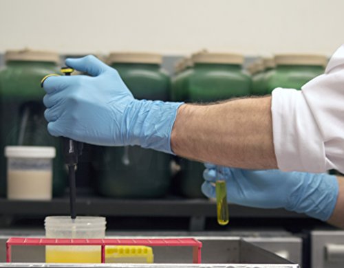 The Ammex Xtreme industrial-grade nitrile, powder-free glove has a palm thickness of 4 mils and a finger thickness of 5 mils and is 12" long from the tip of the middle finger to the edge of the beaded wrist cuff, which is 3 mils thick and extends to cover the hand, wrist, and forearm. Nitrile provides better elasticity than vinyl, better puncture resistance than latex or vinyl, better abrasion resistance than chloroprene, and reduces the likelihood of allergic reaction. This glove is suitable for non-medical uses, including use in the automotive industry or for other heavy-duty applications. The glove is textured on the fingertips, fingers, and palm for improved grip, particularly in wet environments, compared to gloves with textured fingers. This powder-free glove leaves no residue, reducing the risk of contamination compared to a powdered glove, making it suitable for use in electronic components, forensic, and laboratory applications. This ambidextrous glove is blue.