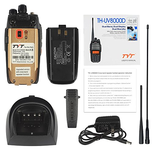 -. Binding : Electronics -. Brand : TYT -. Color : Black -. EAN : 6959011522534 -. Feature : New released by TYT, Dual band, Dual display and Dual standby, you get up to 128*2 Channels to store. Cross-band repeater function is very amazing. / Comes with a High Gain Antenna and a Stubby Antenna. Large capacity of 7.2V 3600mAh. This set is quite suitable for outdoor activities. Ultra high output power UP to 10W to guarantee a farther and stable communication range. / VOX transmitting, TOT, 1750Hz tone, CTCSS/DCS scanning, COMP function, 2 Tone/5 Tone, FM radio function, can store up 25Radio channels, Reverse frequency function. / DTMF encoding and decoding, Channel spacing selectable (25/12.5kHz), Remote Kill/Stun/Activate/Revive, Tri-color background light selectable, Non-standard CTCSS/DCS input. / Programming software: https://s3.amazonaws.com/sanatop/EB/EB0E03SS/TH-UV8000D+Programming+Software.rar -. Label : RF Gear 2 Go -. Manufacturer : RF Gear 2 Go -. Model : TH-UV8000D -. MPN : TH-UV8000D -. PackageQuantity : 1 -. PartNumber : TH-UV8000D -. ProductGroup : Car Audio or Theater -. ProductTypeName : TWO_WAY_RADIO -. Publisher : RF Gear 2 Go -. Studio : RF Gear 2 Go -. Title : TYT TH-UV8000D Upgrade Dual Band Transceiver, Cross-band Repeater Two-way Radio, 10W 136-174/400-520MHz, with 7.2V 3600mAh battery and 2 antennas, Black