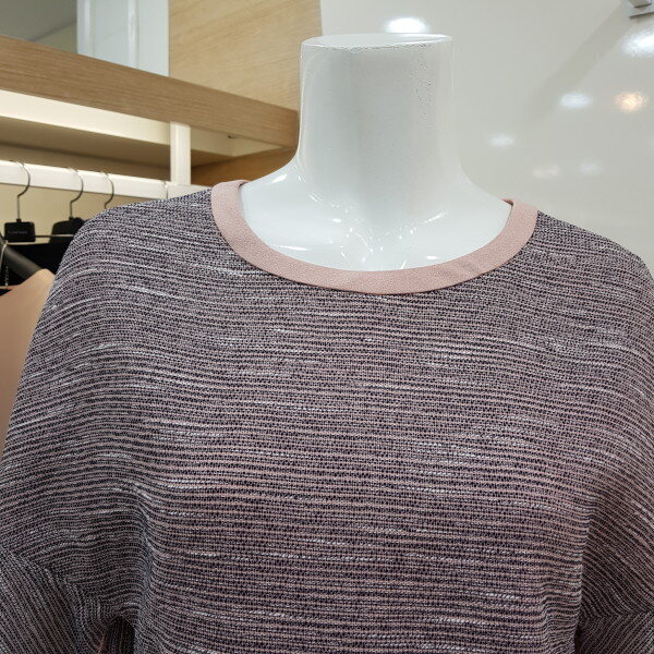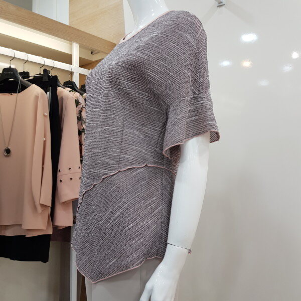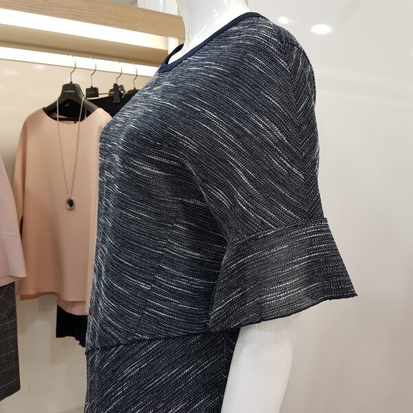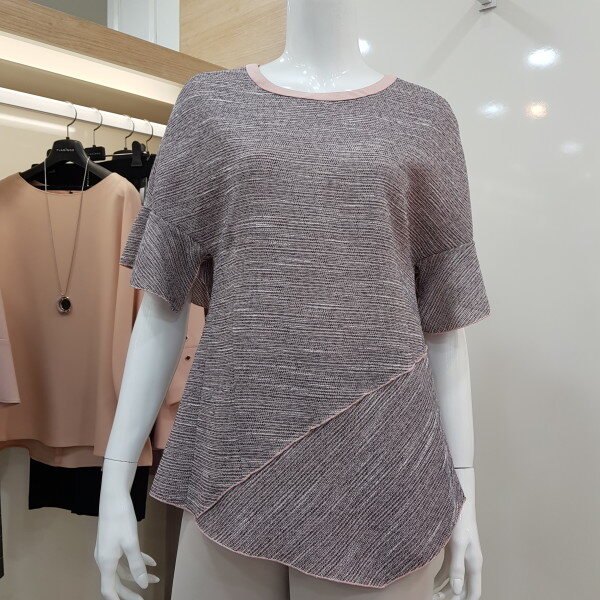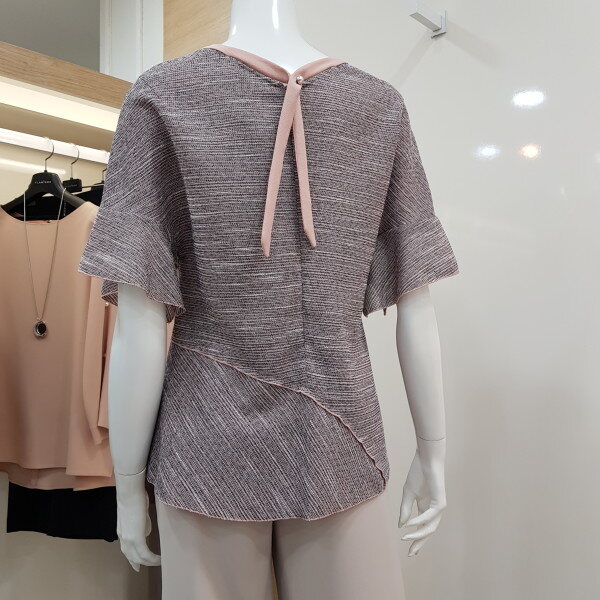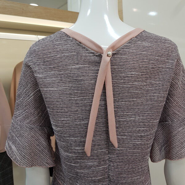 라운드 목선으로 깔끔하고 뒷목선 리본포인트를 주어 귀엽고 언발란스 디자인으로 세련되고 멋스러운 스타일입니다.