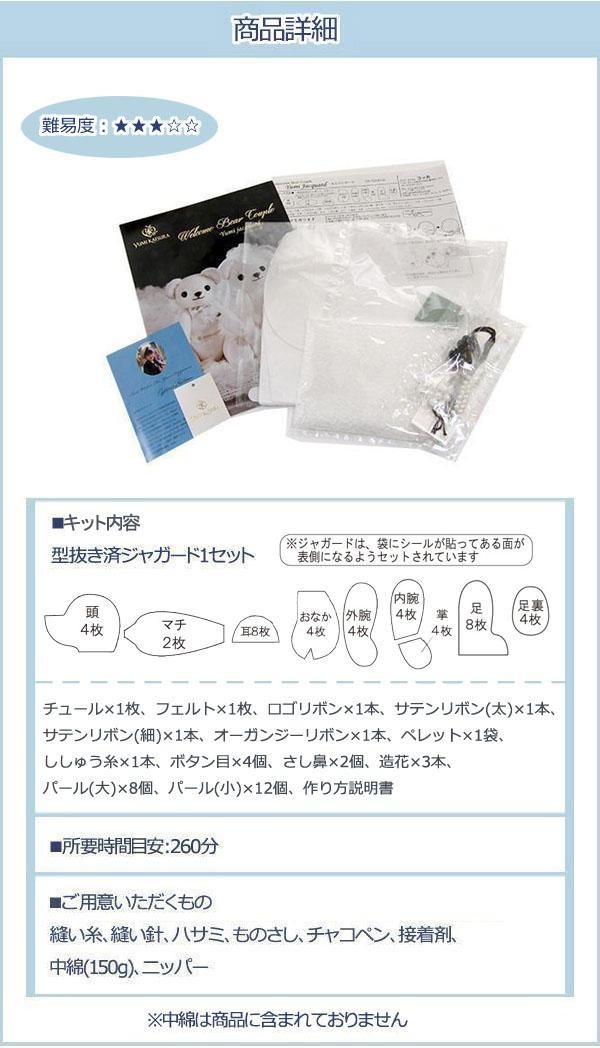 ブライダルファッションデザイナー桂由美のウェルカムベアキット♪ヨーロッパ調の頭身の高いテディベアタイプです。オリジナルのジャガード生地には「YUMI KATSURA」のブランドロゴがさりげなく織り込まれています。ぬいぐるみ生地はカット済みなので、すぐに縫い始めることができます。 |