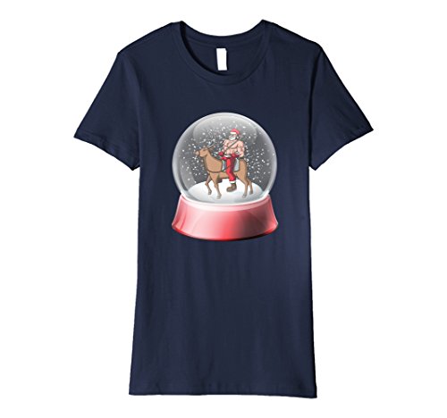 - This is a Christmas snow globe shirt with a shirtless muscular Santa riding a reindeer inside the snow globe.