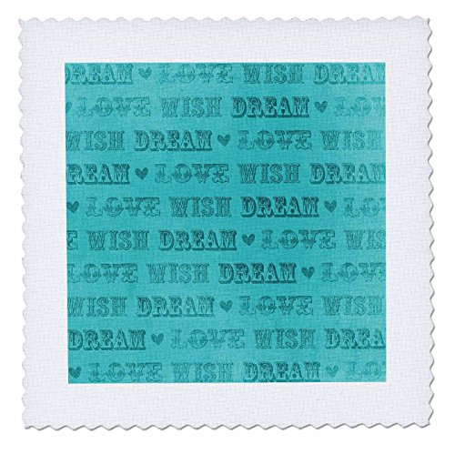3dRose qs_167561_1 Turquoise Words Wish, Dream, Love Quilt Square, 10 by 10"