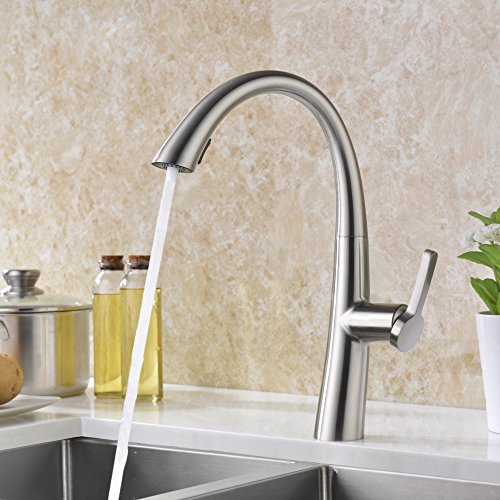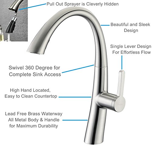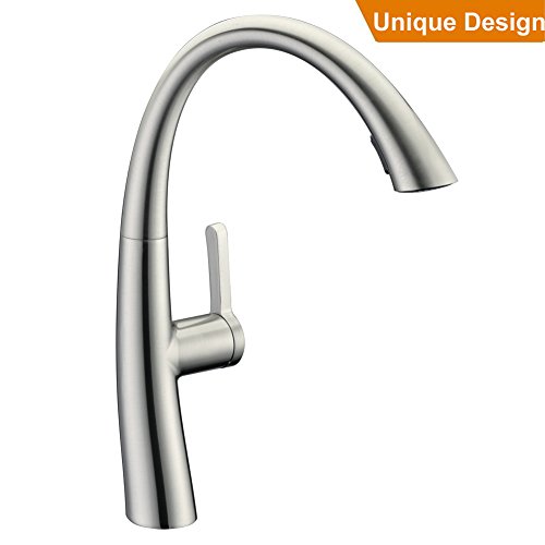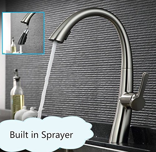 This kitchen faucet has a beautiful and sleek design. The pull out sprayer is cleverly hidden.Certified NEOPER nozzle. Healthier and durable. Brushed Nickel finish.
