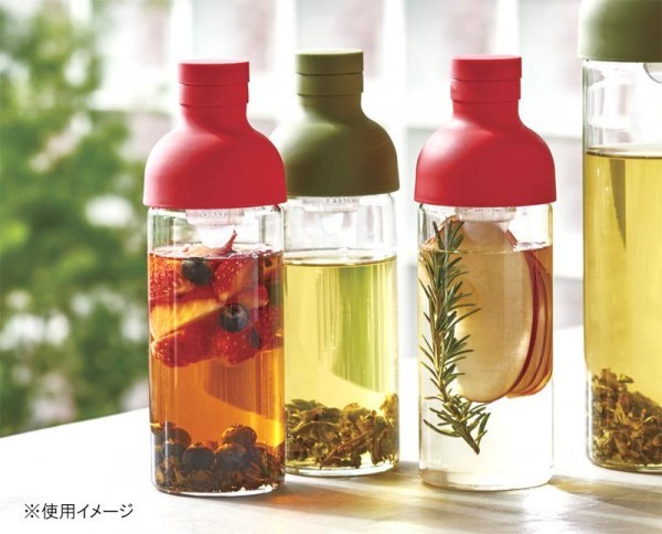 ワインのように食事の時に水出し茶を愉しんでいただきたいという思いからできた、ワインボトル型の水出し茶ボトル。注ぎ口部分にフィルターがセットされているのでそのまま注げます。 |