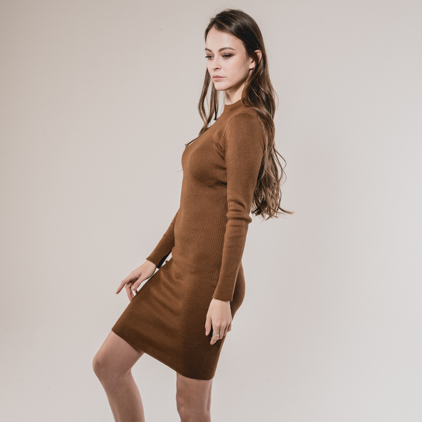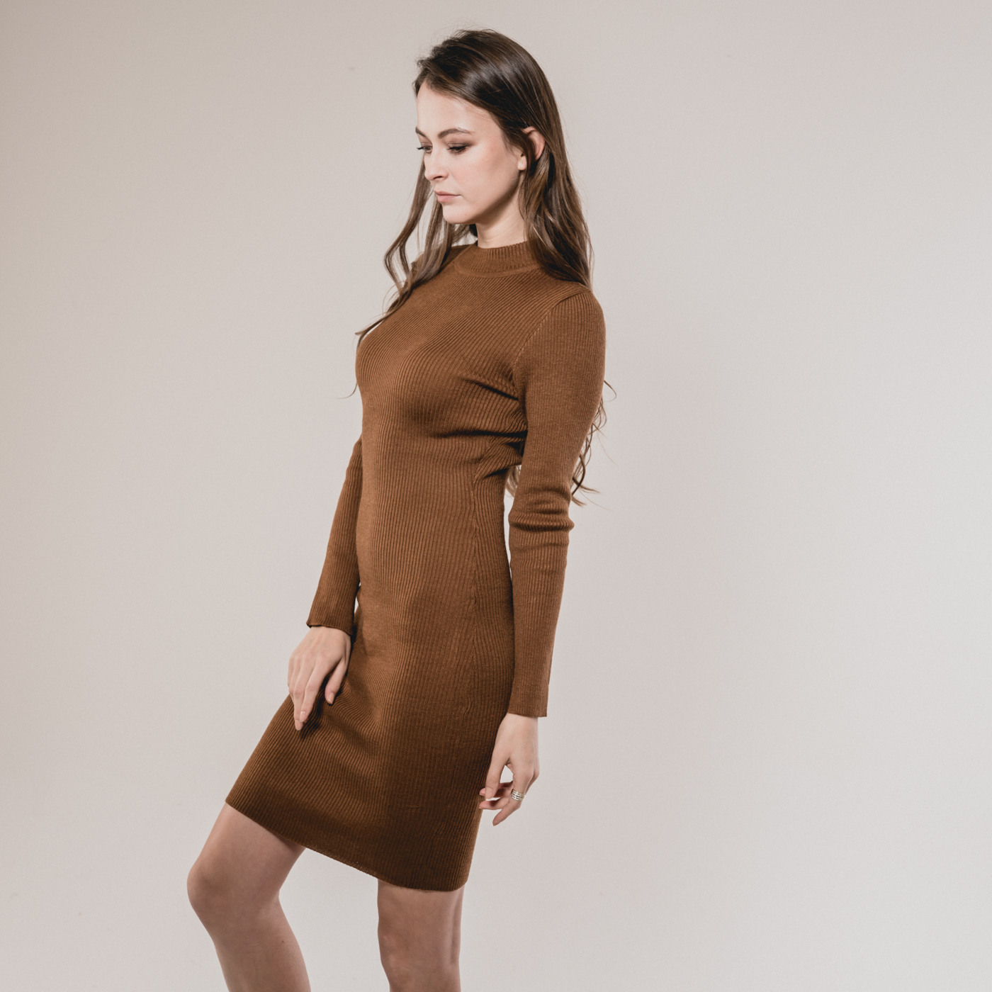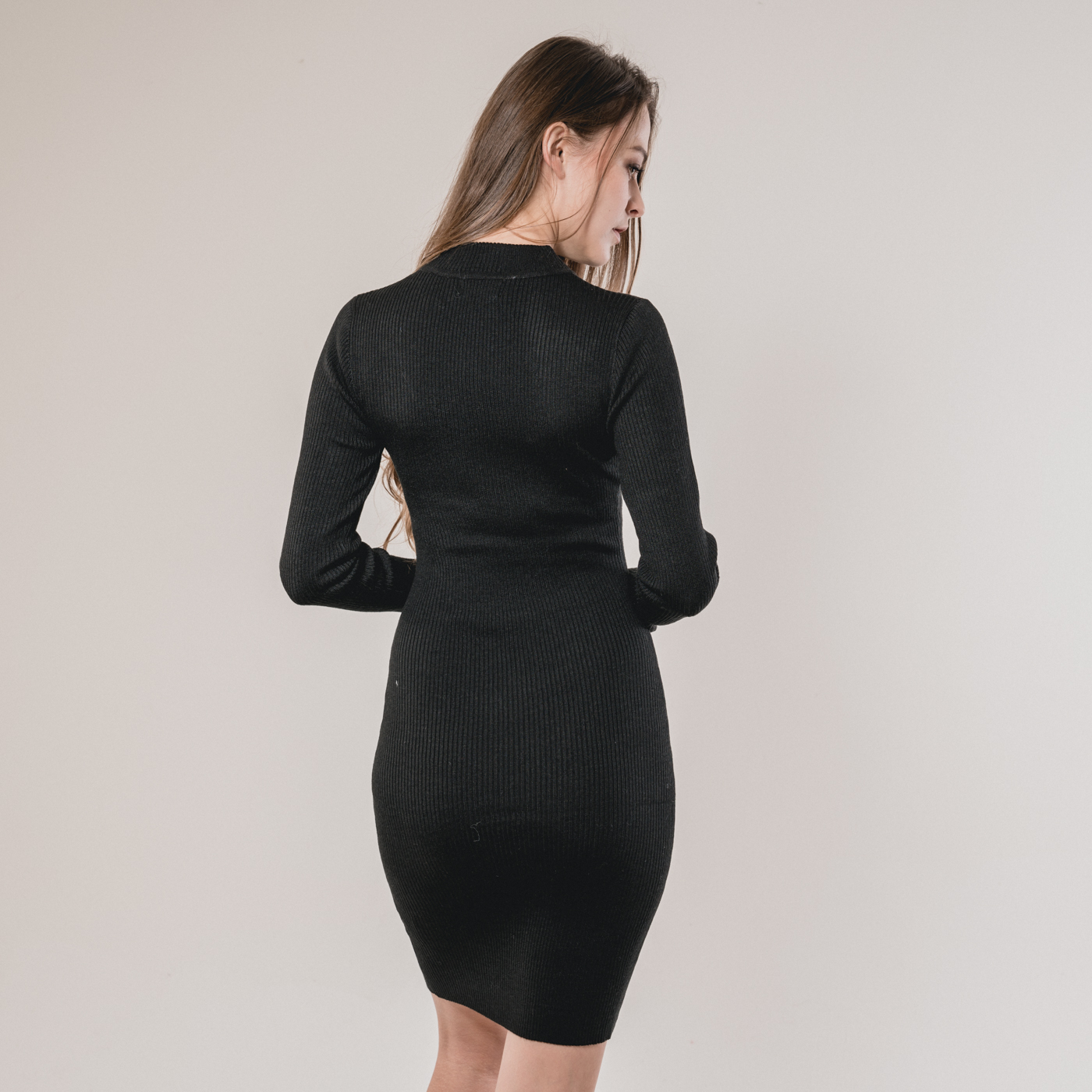 슬림해 보이는 하이넥 니트 원피스로 레이어드 하기좋은 아이템 디자인입니다.