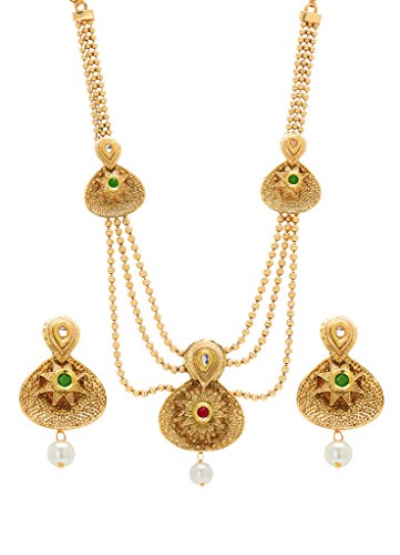 This Bindhani traditional long rani haar jewellery set is perfect choice for any age of women or college teen girls. Long necklace set made in excellent quality of alloy metal and brass round ball chain with antique look high gold plated. This Kasu Haram necklace set Can be wear in Wedding , Festive or Party . Trendy and fancy stylish Earrings set can be team with any ethnic ensemble attire for a stunning lavish look in party or head out.Feature