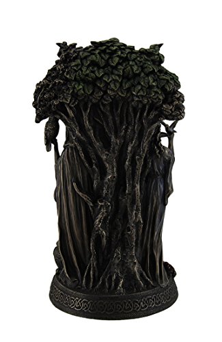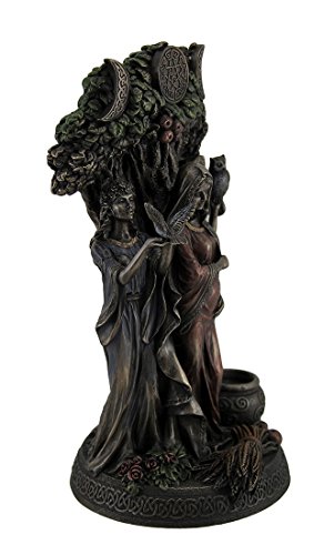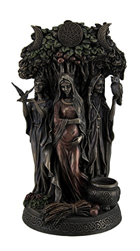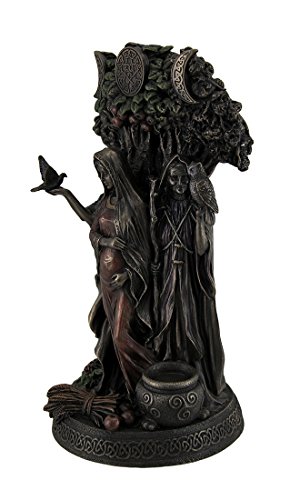 Studio : Zeckos Publisher : Zeckos Binding : Kitchen Product Description Celebrating the cycles of life, nature and the seasons, this statue depicts the Celtic Danu the Triple Goddess of Tuatha De Danann. The Maiden is Spring, new beginnings, possibilities and the waxing crescent moon. She stands holding a dove in her hands with flowers at her feet. The Mother is bounty of the earth, summer fruition and early harvest as well the full moon. She is rooted in the life-giving oak tree, seen above and behind the Goddesses, depicted with a swollen belly for she is creation, fertility and motherhood. The Crone is the waning crescent moon, seen at the end of the growth cycle when the leaves turn, and final harvest. She is the sleeping earth in winter. She holds the wise owl in her hand and a cauldron lays at her feet. Intricately sculpted in cold cast bronze, a process that mixes bronze powder with resin, the finish has the look of authentic metal, and take notice of the colored effects that highlight this conceptual statue. 10.5 inch high x 6 inch long x 5 inch wide. It's a striking must-have piece rich with Celtic symbols perfect for anyone into nature religions. 0