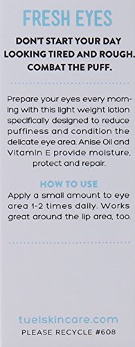 ReleaseDate : 2014-04-11 Studio : Tu'el Publisher : Tu'el Binding : Health and Beauty Product Description This classy and stylish eye treatment from Tu'el prepares your eyes every morning. It is specifically designed to reduce puffiness and condition the delicate eye area. Anise Oil and Vitamin E provide moisture, protect and repair. 0