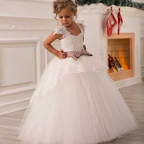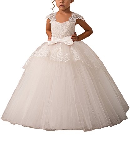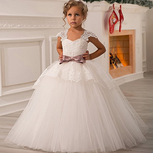 Elegant Lace Appliques Cap Sleeves Tulle Flower Girl Dress White Ivory 1-14 Year Old