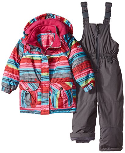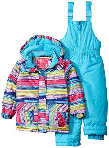 Two-piece set featuring solid-tone snow bib and striped coat with hood