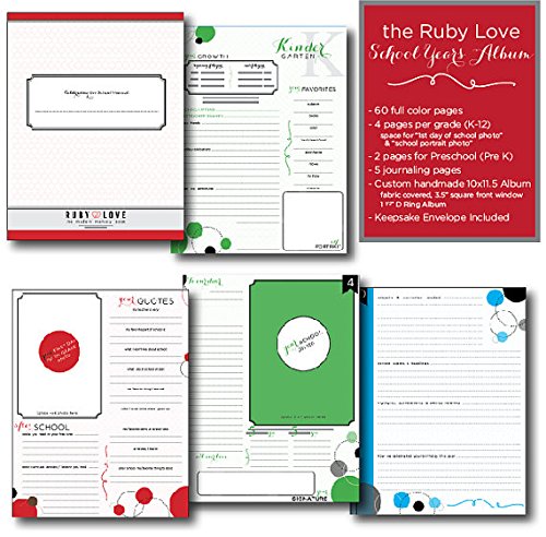 Studio : Ruby Love Baby Publisher : Ruby Love Baby Binding : Baby Product Product Description The Dandelions School Years Album by Ruby Love Baby is the perfect way to document your child's Pre-Kindergarten through 12th grade years. These memory keepsake albums allow you to record the many details and memories your child experiences during his or her school years and will make a meaningful gift for your graduating senior! Each handmade 12" x 11" ~ 3 ring album (1 ½" D Ring Album with button and string closure) comes with 60 custom designed pages (30 front and back) to record the many memories of your child's grade school years. The album focuses on the learning and interests of your child, so it is relevant no matter if you homeschool, public school, or private school. The pages (size 8.5" x 11") include fun prompts and plenty of room for parents' notes as well as space for child participation ("draw a self portrait", "write your name", etc.). For each year, prompts are provided for you to ask your child, such as "what do you want to be when you grow up?" and "what is your favorite part about school?" Each year asks the same questions so you can easily see the progression. Additionally, for grades Kindergarten through 12th, space is provided for your child's "1st day of school photo" as well as his or her "school portrait photo". Two pages are specifically designated for Pre-K and also include space for your child's "1st day of preschool photo". All other grades are divided into 4 pages each. All School Years Albums come with a matching keepsake envelope that is perfect for storing your little scholar's priceless projects and crafts. To see more designs or for more information, please visit our website: www.rubylovebaby.com. 0