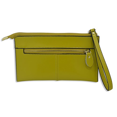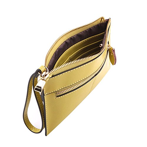 - Feature : It is made of very high-grade Genuine top layer Cowhide leather (pls check attached bit genuine leather sample by side Zipper's head) which touches exquisite and smooth, it's durable and pretty, the interior lining layer is made by soft Genuine leather as well / Dimension: 8.2. x 5.0 x 1.0 inches (L x W x H), enough room it's very comfortable to store any small stuffs whatever you like / Compatibility: Suitable for Apple iPhone 6 (4.7) iPhone 6 Plus (5.5), 5/5S/5C, Samsung Galaxy S6 S5 S4 S3 Note 4, 3, 2, HTC and all other cellphone, money, ID card, credit card, keys, and other small stuffs / This super convenient bag can be used as a handbag, clutch bag, purse wallet, wrist bag, Wrist strap design makes clutch into an essential and easy to carry, non-removable wrist strap is 6". Unique design highlighted feminine elegance / Great zipper bag, interior have one invisible Zipper, outside have 2 zippers which can be visible, it is precise and multi-function designed with 3 separate pouches, 6 card slots, 2 cash/receipts slots. Best organizer for women