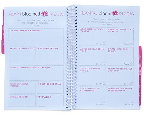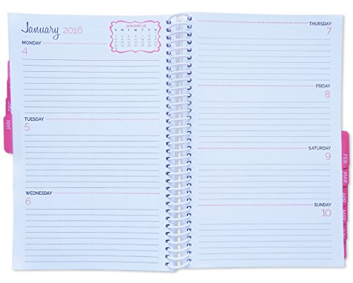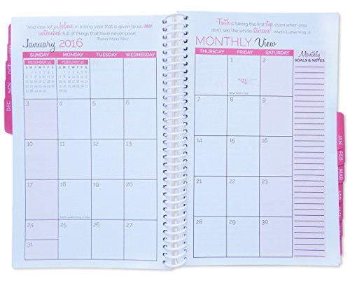 - Feature : 5.5" x 8.25" Daily Planner. Calendar runs from August 2015 to July 2016 / 2 Page Monthly View Spreads followed by Spacious Weekly Views / Sturdy Covers with Matte Film Lamination make Covers Flexible but Durable / *NEW FEATURE:* MONTHLY TABS plus Pocket on Back Inside Cover / Special Icons on Select Holidays, Inspirational Quotes on each Monthly View, End of Month Reflection Questions, Goal Tracking Tools & More!