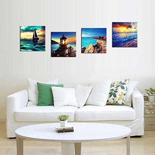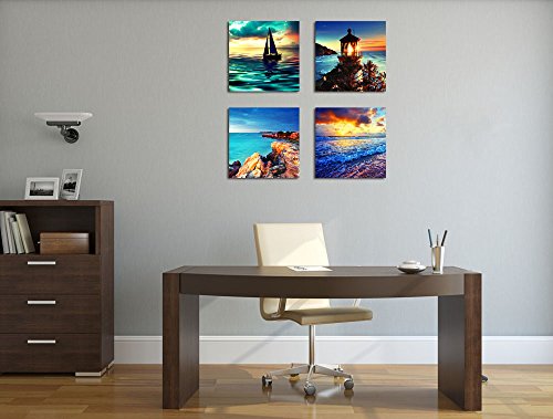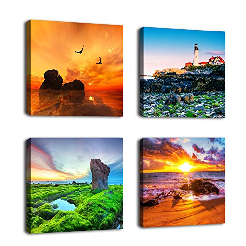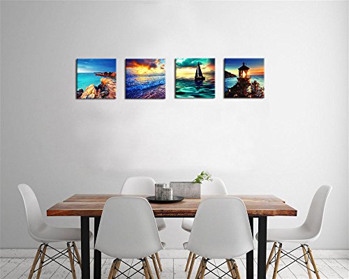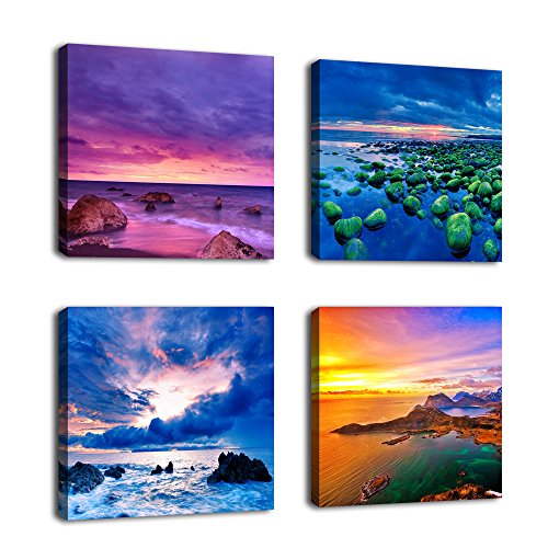 Ocean Canvas Art Sea Waves Beach Wall Art Canvas Prints of 4 Panels Seascape Pictures Sunset Sea Artwork Framed Ready to Hang