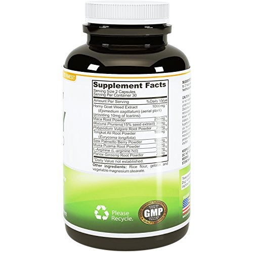 - Feature : Each capsule contains 1000 mg of Horny Goat Weed Extract which would have 10 mg of Icariins, a natural aphrodisiac and libido enhancer / Contains at least 250 mg of Maca Root Powder / Our Horny Goat Weed blend is formulated to boost stamina, mental alertness, and the immune system / A mix of 9 natural herbs to ensure that you get the maximum potency and effectiveness of our Horny Goat Weed supplement / 100% money back guarantee!