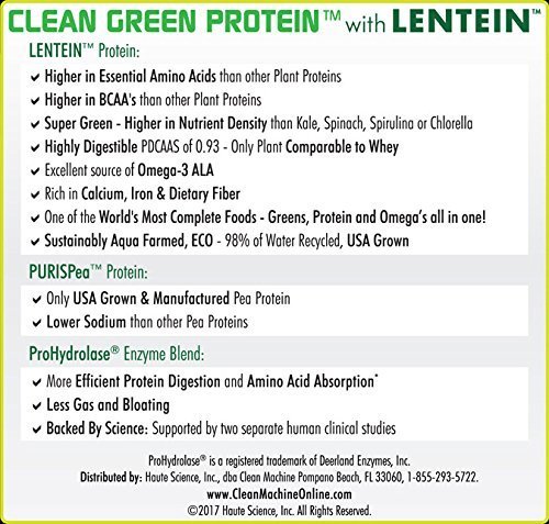 -. Brand : CLEAN MACHINE -. EAN : 0857508004067 -. Feature : COMPLETE SUPER FOOD - Lentein is considered the world's most complete food source: super protein, super green, and super omega. This product is the only plant protein comparable to whey. / ULTRA SUSTAINABLE - Lentein is minimally processed, and is one of the most sustainable food sources in the world. It is made from water lentils, which are produced in facilities where 98% of the required water gets recycled. / TOPNOTCH INGREDIENT - Lentein is the most extraordinary protein and super food available, winning the American Food Technology & Innovation Summit's Future Ingredient Award. Clean Green Protein is the first product on the market to contain Lentein. / HEALTHY ADDITIONS - Clean Green Protein also contains USA Grown PURISPea Protein, an eco-friendly, USA-grown pea protein. It also has Prohydrolaze Enzyme, which promotes efficient protein absorption to decrease bloating, gas, and stomach discomfort. / PLANT-BASED PROTEIN - Formulated by Masters Class Natural Bodybuilder and Natural Physique Champion Geoff Palmer. Clean Green Protein was born from the desire to have a natural, effective, and plant-based nutritional supplement available on the market. -. IsAdultProduct : 0 -. Label : Clean Machine -. LegalDisclaimer : These statements have not been evaluated by the Food and Drug Administration. This product is not intended to diagnose, treat, cure, or prevent any disease. -. Manufacturer : Clean Machine -. MPN : 08004067 -. PackageQuantity : 1 -. PartNumber : 08004067 -. ProductGroup : Health and Beauty -. ProductTypeName : DIETARY_SUPPLEMENTS -. Publisher : Clean Machine -. Studio : Clean Machine -. Title : Clean Machine Clean Green Protein with Lentein - Vanilla -. UPC : 857508004067