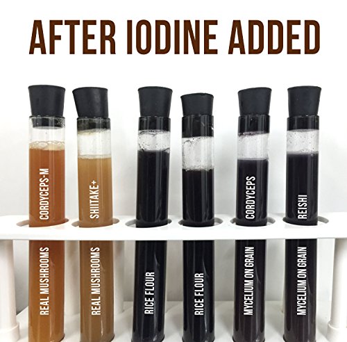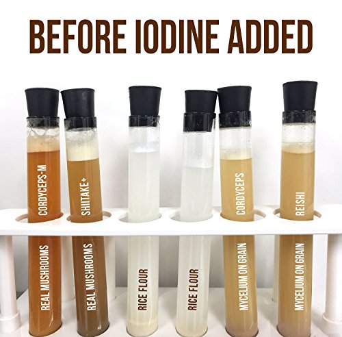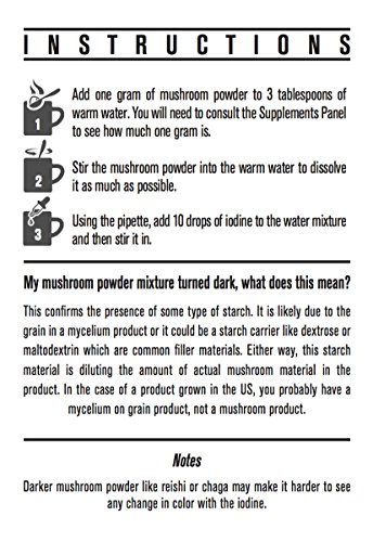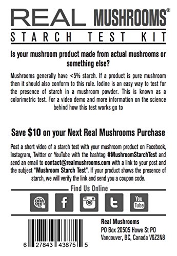 Studio : Real Mushrooms Publisher : Real Mushrooms Binding : Health and Beauty Product Description Does Your Mushroom Products Contain Starch? Let's Find Out You might not have realized it but your mushroom product may contain some type of starch filler. This can be in the form of dextrose or maltodextrin which is a common carrier material or it can be in the form of grain. Grain is a common growing material used for many mushroom supplements which are made through a growing method called mycelium on grain. Mycelium on grain products are in fact, not made from mushroom, but fungal mycelium (the mushroom root system) grown on grain which is then dried and powdered grain and all. These products end up with a very high amount of starch from the grain that ends up in the final product so it is very important to determine whether your mushroom supplement has a high amount of starch in it or not. The 5% Mushroom Starch Rule Medicinal mushrooms generally have <5% starch so a product claiming to be made from pure mushroom should also confirm with the rule. This is where the Real Mushrooms Starch Test Kit comes in. What's is This Test Kit? This test kit allows you to perform a very simple colorimetric test to show the presence of starch in a mushroom product. It is called an iodine starch test. By adding iodine to a water solution of your mushroom product you can test for the presence of starch. If the product contains a high amount of starch the water solution will turn purple or black. You can look this up on YouTube (search "iodine starch test") for demonstrations and the science behind it. What's Included - A 25ml bottle of 2.5% iodine solution - A 5ml plastic pipette - One set of instructions. 0