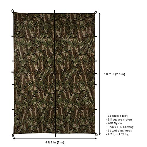 VERSATILE - With 20 reinforced webbing loops in and around the perimeter, 1 top center loop for overhead hanging and pole inserts in all four corners, you’ve got all angles covered. Set it up in virtually any situation - you don't even need trees! Say goodbye to regular tarps, and hello to a tarp that’s stronger, quieter, more compact, more versatile, longer lasting, and more waterproof.