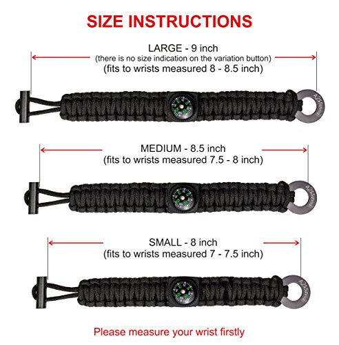 - UNMATCHED POWER & VERSATILITY: Suitable for wrist sizes that measure between 7-8.5 inches. The unraveled parachute cord rope is about 3.5 to 4 meters in length. The most necessary camping gear for every one. Please notice both bracelets are the same size. SPECIFICALLY DESIGNED not to hurt you: The sharp fire scrapper edge is hidden in the rope waving. Needs to rotate it when you want to use it.