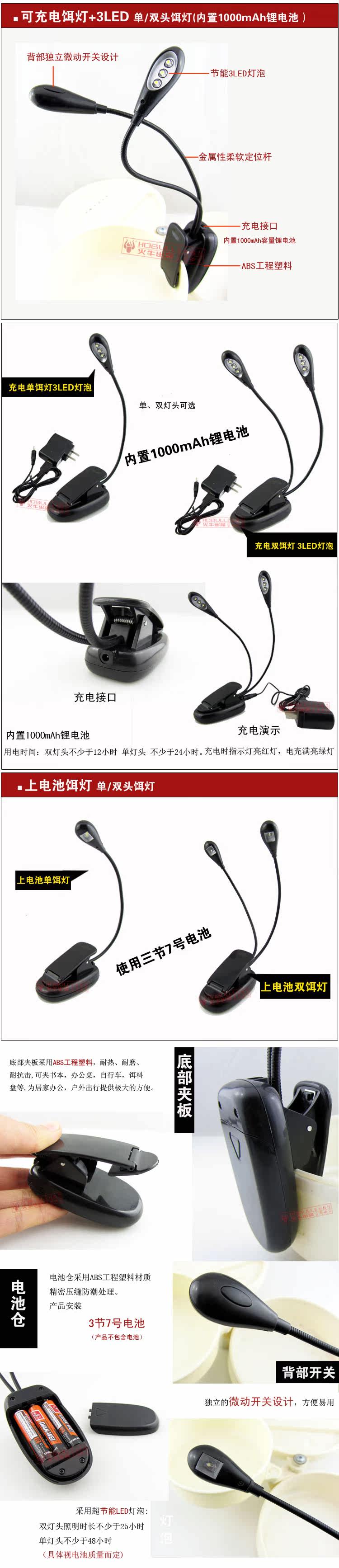Rechargeable bait lamp parameters: Surface material ABS plastic Light bulb 3 LED bulbs Lamp life of 100,000 hours Stalls Battery type built-in 1000mAh lithium battery Lighting time two lights not less than 12 hours, single light not less than 24 hours Product color is black Overall dimensions 23cm