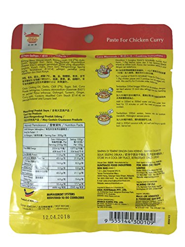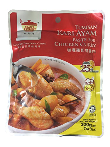 Recipe: Put 1 packet of TEAN'S GOURMET Chicken Curry Paste (200g), 1.5kg chicken pieces and 2 potatoes (cut into cubes) into the wok. Mix and fry for 5 minutes under medium heat. Add in 250ml to 500ml water and simmer under low heat for 15 minutes or until the meat and potatoes are cooked. Add in 200ml coconut milk, stir well and bring to a quick boil. Serve hot.