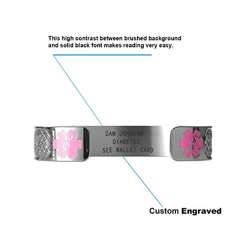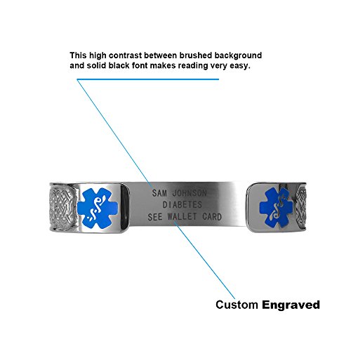 -. Binding : Jewelry -. Brand : Divoti -. Department : womens -. Feature : Easily provide your custom engraved content by selecting the CUSTOMIZE NOW button to the right. / Custom engraved in high contrast black laser engraving to personalize your medical message (4 lines incl. 20 Characters Per line, icluded spaces). / Hypoallergenic 316L medical alert bracelet-6" cuff style (fits 6.5-8.0 inches). / Deep embossed caduceus symbol with hard enamel symbol on the front of medical alert bracelet. Excellent wear resistance. / Includes free customizable medical alert wallet card, medical alert smartphone apps and Velvet gift bag. -. Label : Divoti Inc. -. Manufacturer : Divoti Inc. -. Model : 5304S -. MPN : 5304S -. PartNumber : 5304S -. ProductGroup : Jewelry -. ProductTypeName : FASHIONNECKLACEBRACELETANKLET -. Publisher : Divoti Inc. -. Studio : Divoti Inc. -. Title : Divoti Custom Engraved Celtic Knot 316L Medical Alert Bracelet -6" Cuff (fits 6.5-8.0")