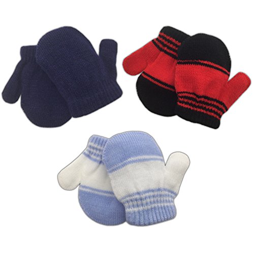 Product Description 3 Pack Assorted Mittens for Boys. Assorted Colors inculde popular boys colors. Made of 95% Acrylic / 5% Spandex. Keeps your babies hands Warm all winter! 0
