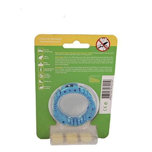 -. Brand : Mosquit-Go -. Color : Blue -. EAN : 0636790978443 -. Feature : COMFORTABLE expandable band expands to fit Parents or children with ease / TIME RELEASED Citronella Pods fit inside 3 pockets for pest relief lasting up to 15 days. / NATRUAL: Citronella essential oil is deet free and non toxic. Safe for long term exposure. No more dangerous chemical sprays / Ideal for Beach Vacations down south and camping trips alike! / Refill packages available soon for regular use -. Label : JP Warehousing -. Manufacturer : JP Warehousing -. ProductGroup : Lawn & Patio -. ProductTypeName : OUTDOOR_LIVING -. Publisher : JP Warehousing -. Studio : JP Warehousing -. Title : Mosquit-go Mosquito Repellent Bracelet: reusable All Natural Non-Deet Wristband with 3 Citronella pods -. UPC : 636790978443 -. Warranty : 30 Day money back guarantee