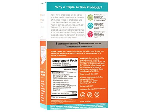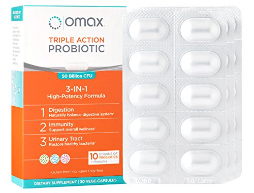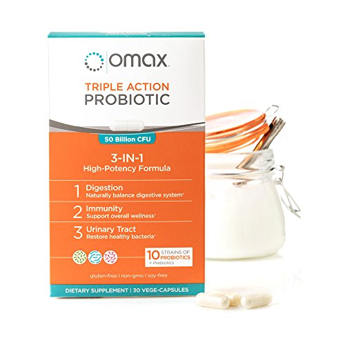 Triple Action Probiotic | Supports Immunity, Female Health & Digestion! Omax Triple Action Probiotic is a high-potency 3-in-1 formula developed with 10 probiotic strains, including Acidophillus, Lactobacillus and Bifidobacterium. Most people know they should take a probiotic, but don't undestand that probiotic strains each do something different for your health. With Omax Probiotic, each probiotic strain targets a unique part of the gut microbiome to support digestion, immunity, vaginal and urinary tract health. The addition of a prebiotic, from chicory root fiber (