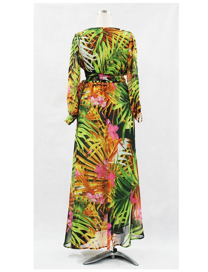 リゾート気分満喫のインパクトある植物柄マキシワンピースです。
