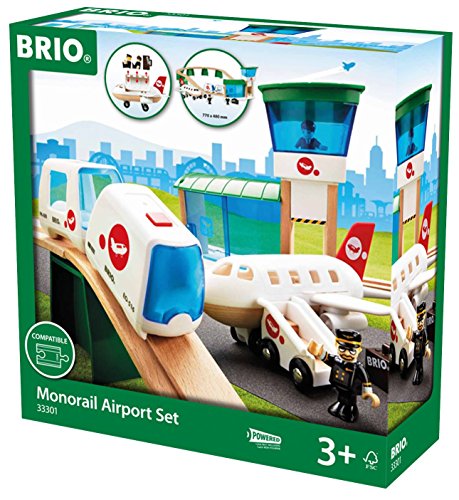 22 pieces; battery powered Monorail train, terminal with control tower, track risers, airplane with moveable stairs, airline captain and passenger