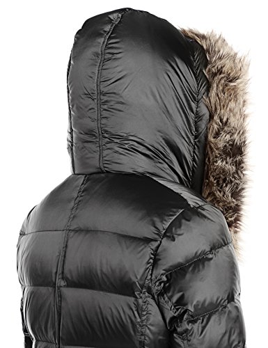 Quilted down coat featuring asymmetric front zipper and hood trimmed in faux fur