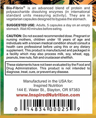 Studio : Inspired Nutrition Publisher : Inspired Nutrition Binding : Health and Beauty Product Description Bio-Fibrin is formulated to be the best natural dissolver of fibrin available. Fibrin is a protein string that holds biofilms and cysts together. Fibrin that dies and packs together also helps form scar tissue. Out of thousands of enzymes that dissolve foods, there are 5 that are very good at dissolving the particular protein that makes up fibrin. We have designed the perfect blend of those 5 proteolytic (protein dissolving) enzymes together in our Bio-Fibrin. Thousands of people, professionals and clinics now attest to the wonderful results of our?Bio-Fibrin in our protocols and as well with internal scar tissue! Allergen Warning: Contains Soy. 0