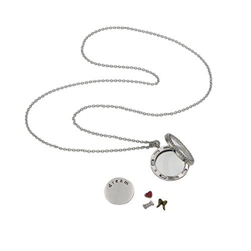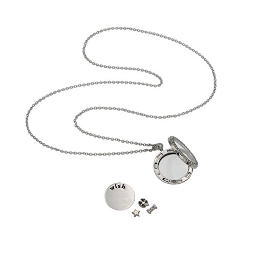 -. Binding : Jewelry -. Brand : Rosemarie Collections -. Department : womens -. Feature : Locket contains a selection of colorful petite charms / NECKLACE : silver tone link; 26 inches long; 1.25 inch pendant hangs affixed to necklace / Charms and stamped plate are removable to create different looks / Clear glass front and back, clear rhinestone embellished locket can be worn on either side / Packaged in a lovely gift box -. Label : Rosemarie Collections -. Manufacturer : Rosemarie Collections -. ProductGroup : Jewelry -. ProductTypeName : FASHIONNECKLACEBRACELETANKLET -. Publisher : Rosemarie Collections -. Studio : Rosemarie Collections -. Title : Rosemarie Collections Women's Floating Charms Locket Pendant Necklace